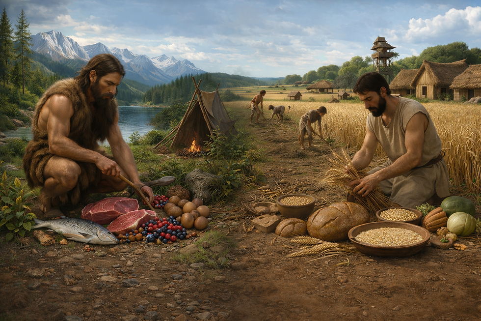 In de vorige blogs hebben we gekeken naar wat mensapen en de eerste mensen aten in de afgelopen 7 miljoen jaar. Van bladeren, vruchten en fruit tot vlees, vis, schaal- en schelpdieren en eieren. Dat voedingspatroon veranderde heel geleidelijk, en ons lichaam paste zich steeds aan. Maar met de komst van de landbouw veranderde dit in korte tijd radicaal.